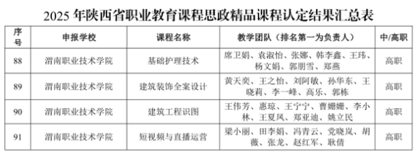 近日,陕西省教育厅公布了2025年陕西省职业教育课程思政精品课程认定结果,我校《基础护理技术》《建筑装饰全案设计》《建筑工程识图》《短视频与直播运营》4门课程成功入选,充分彰显我校课程思政建设的阶段性成效与育人特色。