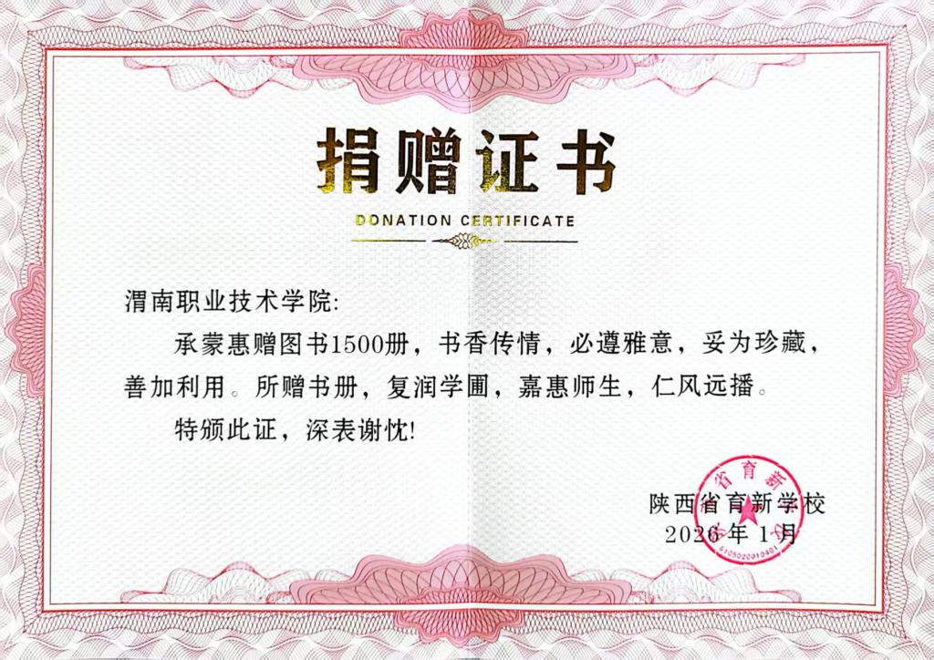 仪式尾声,陕西省育新学校向渭南职业技术学院颁发了捐赠证书,鎏金的文字熠熠生辉,既见证着两校的深厚情谊,更镌刻着对专门教育事业的共同担当。